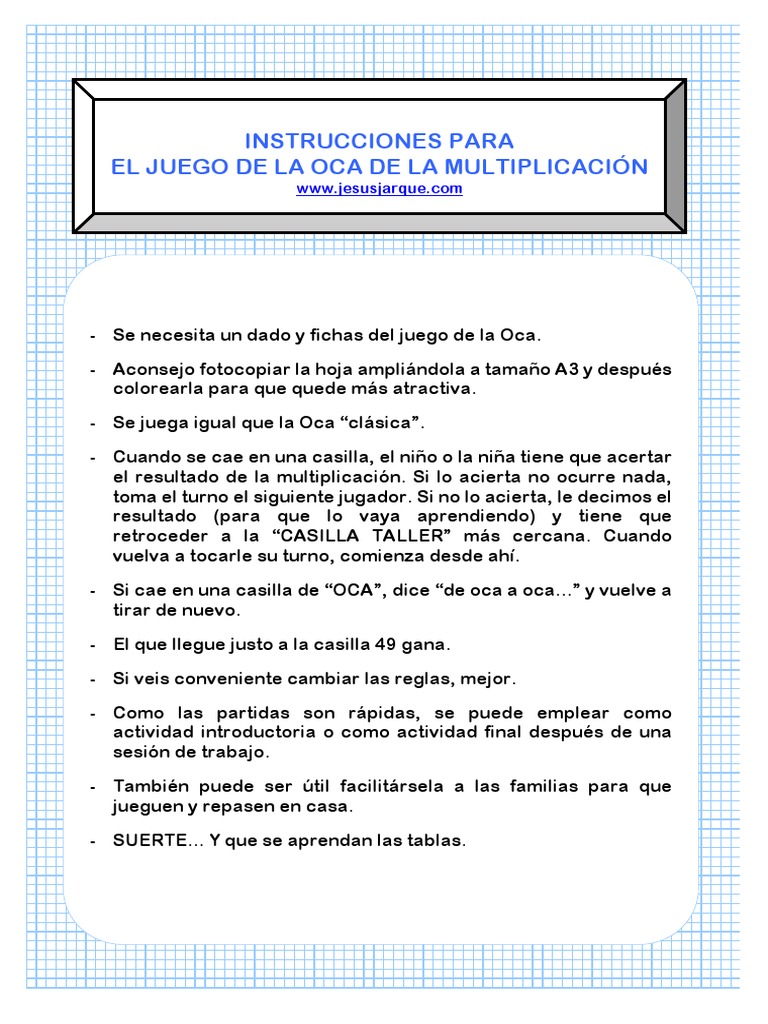 La oca instrucciones y reglas. Como hacer te enseña a jugar al juego de la oca. Conocer sus reglas e instrucciones de juego es algo necesario para empezar con la diversión. Si el jugador cae en una casilla oca (5,9,14, 18, 23, 27, 32, 36, 41, 45, 50, 54 y 59) gana el derecho avanzar hasta la siguiente casilla oca, y además puede repetir el tiro. La oca instrucciones y reglas / reglas ludo y oca pdf ludo se juega con un dado de seis caras y el objetivo es trasladar las 4 fichas desde la c u00e1rcel o la oca instrucciones y reglas :